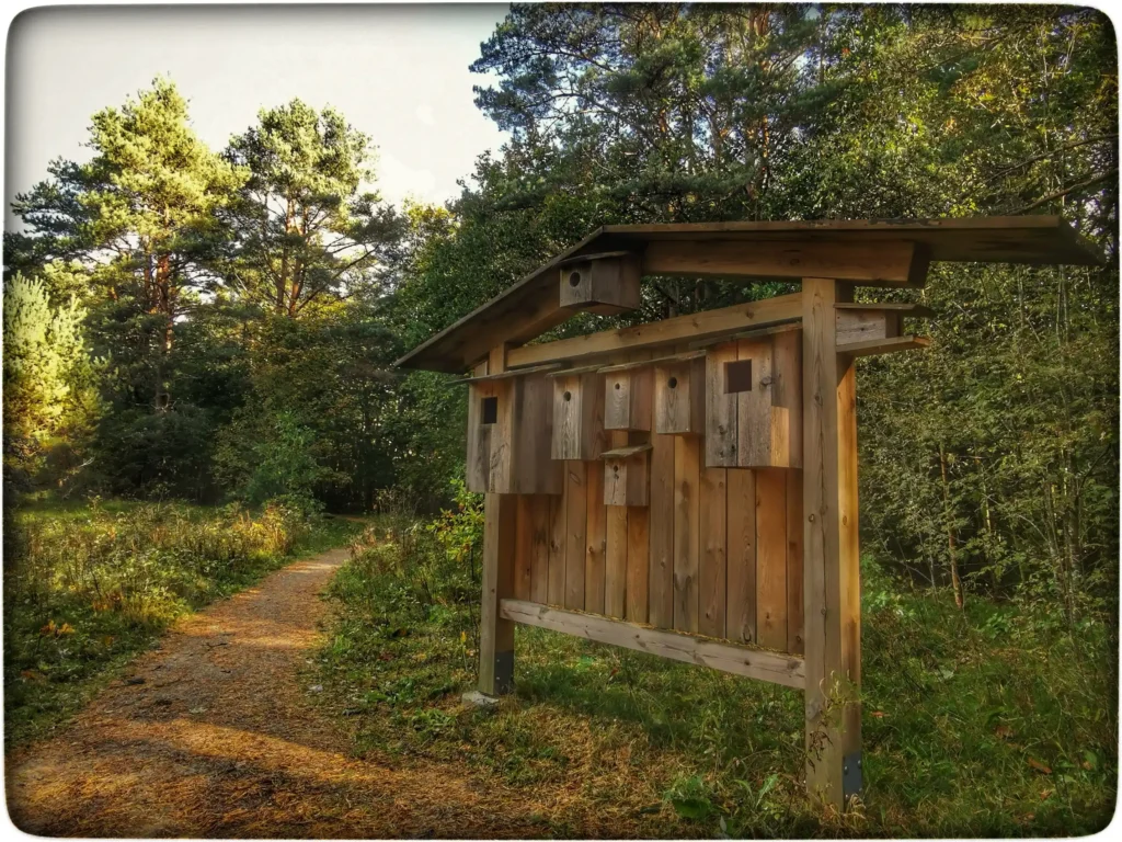 Järgmisena jõudsin erinevaid pesakaste tutvustava kohani ja see oli juba palju põnevam. Infotahvlilt palju huvitavat juttu, aga pesakastide numeratsioon kadunud ja seega oli küllaltki raske viia kokku õiget teavet. Neist kõige erilisemad viisin saadud infoga kuidagi kokku. Näiteks nahkhiire varjekast oli huvitav, sel oli ava ainult põhja all ja linnud seda seega kasutada ei saa. Tundsin juba ühelt teiselt matkarajalt tuttava kolmnurkse kujuga pesakasti ära, mis sobib just porrile kõige enam. Kujundatud ta just selline, lähtudes porri loodusliku pesaehitamise meetodist. Spetsiaalselt Skandinaavias välja töötatud disain, sest sealsetes kultuurmetsades pole porrile piisavalt sobivaid elupaiku. Huvitav oli teada saada, et porr teeb pesa tüve ja sellest eraldunud puukoore vahele või tüve hargnemiskoha lõhedesse.