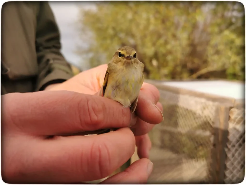 Seni siis käik järgmiste püüniste juurde, mis mõeldud vist kõrkjates elutsevate lindude jaoks. Selleks oli paigaldatud kõrge võrkaed oma salataskutega, mida ei olnud kohe nähagi, mulle näidati neid. Kahes kohas olid sellised püünised, aga need olid praegu tühjad. Siit linde saavat ainult suurte kogemustega töötaja võtta, arvan, et siis vigastuste oht väiksem või muud, ei tulnud ette küsida ka. Kiirel sammul võrkpuuri juurde tagasi ja peaaegu teel sinna oli üks lehelind. Töötaja püüdis teda ajada puuri, aga lind rapsis närviliselt mööda võrgust tunneli seina. Võeti siis pika varre otsas olev hirmuti ja kuniks oli ringi rapsimise ruum nii napp, et lehelind võeti käega kinni.