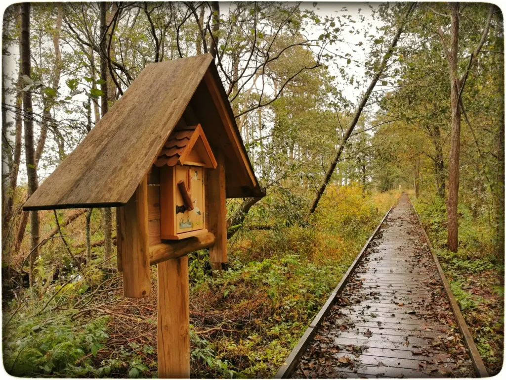 Algul ei saanud kohe aru, millises suunas õpperada algab. Ringikujuline ja 1,8 kilomeetrit kogupikkus, seega nagu poleks vahet. Alustasin vasakpoolsest harust ja peagi hakkasid paistma esimesed huvitava kujundusega infotahvlid. Nende disain oli eriline ja omajagu vaeva nähtud nende tegemisel. Mulle meeldis nende kujundus kõige enam. Riivist sai väikese luugi lahti lükata ja sealt sai siis lugeda ühe looma kohta. Kusjuures pilt luugil ei läinud kokku sisuga ja see oli huvitav omamoodi. Lastele veel eriti põnevad avastada. Esimeses punktis oli kaanepildiks orav ja sisu hoopis ilvese kohta. Midagi rabavalt uut teada ei saanud, põhiliselt siin pandud rõhku vanarahva uskumustele antud looma kohta, natuke üldist juttu ja vanaaegsed nimetused. Viimane oli kõige huvitavam ja nii mõndagi üllatavat sai teada.