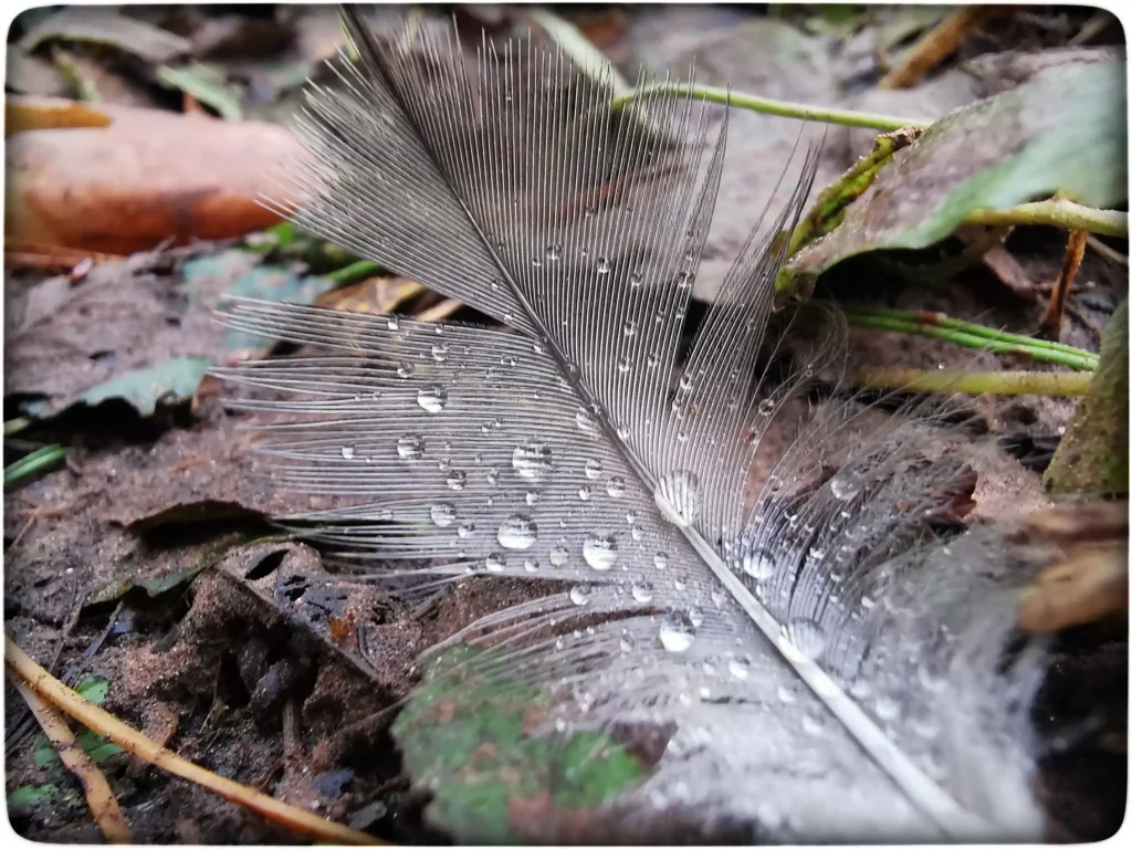 See plats jääb muust piirkonnast kõrvale ja on seega mõnusalt privaatne telkimisala. Rada siin ei lõpe, aga palju maad siit külastuskeskuse ehk raja alguspunktini pole. Leidsin ka ühe vihmapiiskadega kaetud sule, mis oli nagu pärleid täis.