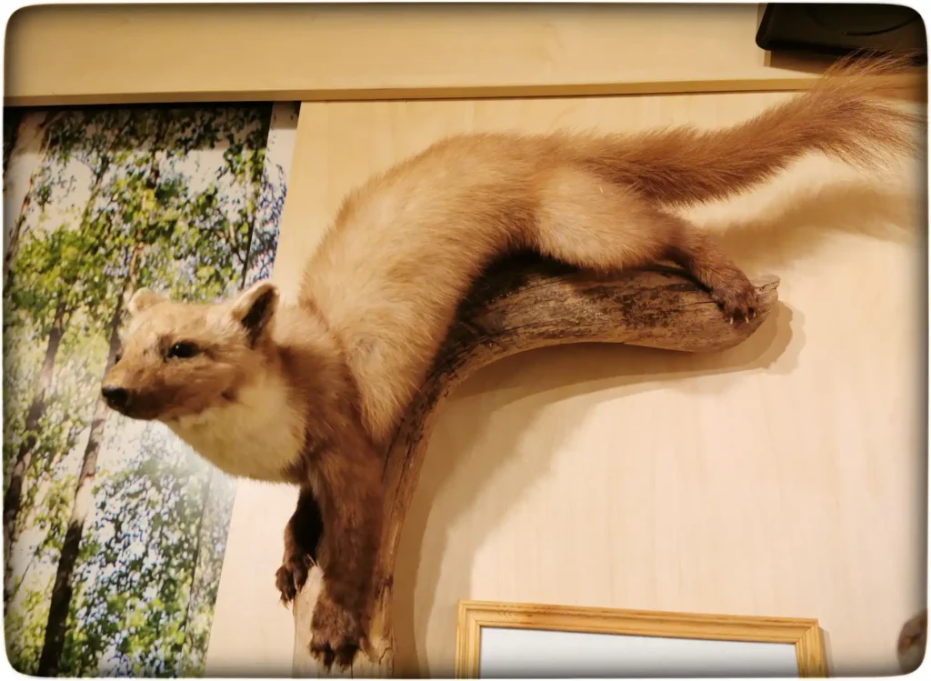 Järgmises ruumis meeldejääv objekt oli nugise topis. Neid loomi looduses pole õnnestunud näha, aga lapsena nägin neid küll hoones ja nende välimus jäi toona eriliselt meelde just hästi koheva saba ning pisikeste ümmarguste kõrvade pärast. Nugiseid kahte tüüpi, metsa- ja kivinugis. Neid eristab rinnal oleva laigu suurus, mis kivinugisel ulatub ka esikäppadele, metsnugisel piirdub see vaid rinnaesisega. Ilusad loomad, hästi painduva kehaga ja nende käpad ka omamoodi lahedad. Siin külastuskeskuses olev metsnugise topis oli hästi ilus ja seatud küllaltki loomutruult puujändrikule poseerima.
