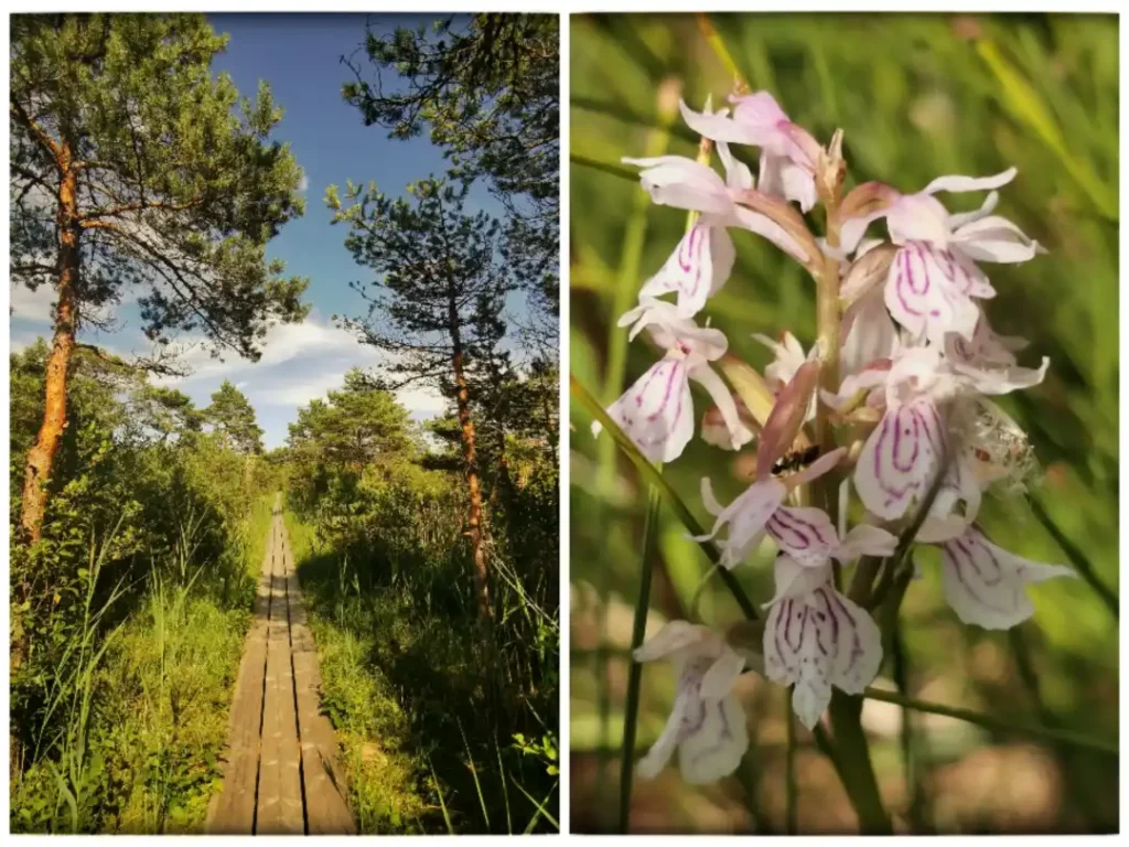 Ilm oli kohutavalt palav või tekitas sellise meeletu higistamise seljakoti kandmine, aga täna tundsin, et seda kuumust on natuke palju mu jaoks. Õnneks tuli peagi puhkenurk ja seal natuke istusime ning kuivatasime oma särke. Rahvast vooris siia rajale täna massiliselt, päris segamatult ei saanudki me end kuivatada, iga hetk võis keegi tulla. Olime jõudnud lõiku, kus laudtee hakkas ja see oli ilmatumalt pikk, kadus silmapiiri sisse ja see oli kasulik, sest nii oli juba hästi kaugelt võimalik liikumine tuvastada. Natuke kuivasime ja siis asusime liikuma, sest vaadata oli plaanis palju. Laudtee viis üle natuke niiskema koha ja taimestik oli sellepärast kohe teine. Suvekuumus siia nii suurt mõju polnud avaldanud ja oli pigem lisaboonuseks. Orhideesid tuli järjest nähtavale, kohati oli neid järjest ja kohe laudtee kõrval. Ma ei suutnud ikka eristada millise orhideega täpselt tegu, kas vööthuule või sõrmkäpaga, aga ühte ja sama õrnlillakate õitega sorti oli siin parasjagu näha.