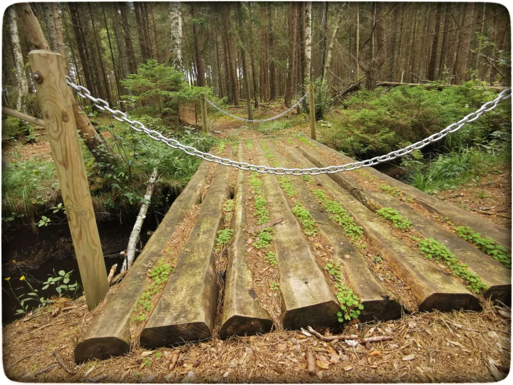 Esimene raja punkt metsateel tutvustas lubja kasutust vanal ajal ja ühtlasi tähistas enamvähem kohta, kus on olnud kunagi ammu lubjapõletusahi. Info oli stendil muidu tuttav, olen sarnast teavet saanud üht teist matkarada külastades. Natuke läks asi huvitavamaks, kui rada muutus korraga üsna kiviseks. Paekivi tükke oli ainult kohati paaris kohas ja sellele lisas veel omakorda erilisust juurde põimumine puujuurtega. Kokku moodustus omapärane kooslus, mis mõjus veidike maagiliselt ja ka veidrana. Ise arvasin, et need kivid pärinevad kunagisest lubjapõletusahjust. Rada ise küllaltki vaheldusrikas, aga mitte ka päris vaimustavalt. Oli metsateed, üle niidu minekut ja kraavide ületusi. Just see viimane oli ühes kohas natuke kummaline. Kaks ülekäiku üle kraavi lähestikku ja üks kummastki otsast kettidega suletud ja kõrvalt uus sild tehtud, mis oli tegelikult vanemaga võrdne, sest mõni laud vetrus kahtlaselt peale astudes, seega olid nad samal tasemel. Välimuselt oli uuem sild kipakam ja vanem näis pehkinud peale kasvava taimestiku tõttu.