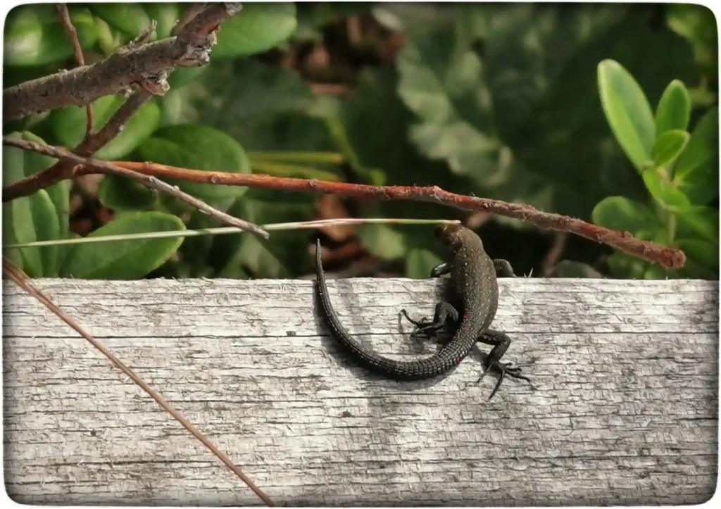 Laudteed mööda minnes läks pilk ikka maha ja mõned tumedad väiksed olendid vilksatasid kiirelt peitu külastajate lähenedes. Sisalikud kasutasid võimalust päikese käes soojendamiseks. Nad olid siin huvitavad, tumedad ja igaüks oli natuke teist tooni, päris samasugust polnud ühtegi. Nad olid küllaltki pelglikud ja pildi tegemiseks pidi natuke nende usaldust võitma rahulike liigutuste näol. Katsusin neid mitte minema hirmutada ja hästi rahulikke ja aeglasi liigutusi nad talusid, eks nemad uudistasid mind samuti siis. Huvitavad toonid olid siin elavatel sisalikel, hästi tagasihoidlikust pruunist mustrist kuni roheka varjundini ja just need viimased olid kõige kartlikumad, neid polnud võimalik pildile saada.