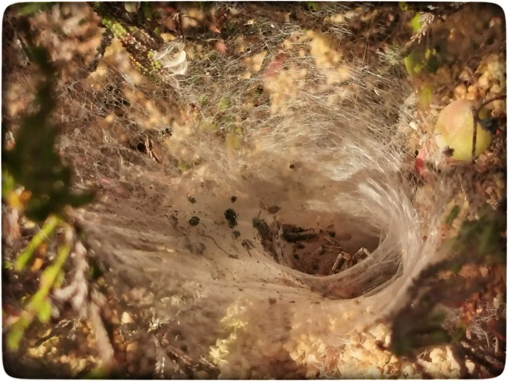 Tulin tagasi tuldud teed, pilk ikka maas ja silmadega otsisin mustika kasvukohti. Korraga märkasin midagi sootuks uut. Ämblikuvõrk oli mättal kanarbikuvarte vahel nagu suur lehter, mis disainitud sinna sattuvatele putukatele surmalõksuks. Nutikas lahendus see. Lehter loodud, mis koondab sinna sattunud putukad otse ämbliku haardesse, mugav, ei peagi muud tegema kui oota, söök tuleb ise koju kätte. Kontrollisin, kas kütt kodus ka on. Hästi õrnalt liigutasin võrgu serva ja peagi tulid lehtri põhjast nähtavale pruunikirjud sihvakad jalad. Isend oli kaval, palju end ei reetnud, ainult esijalgu õnnestus näha, keret hoiti peidus.