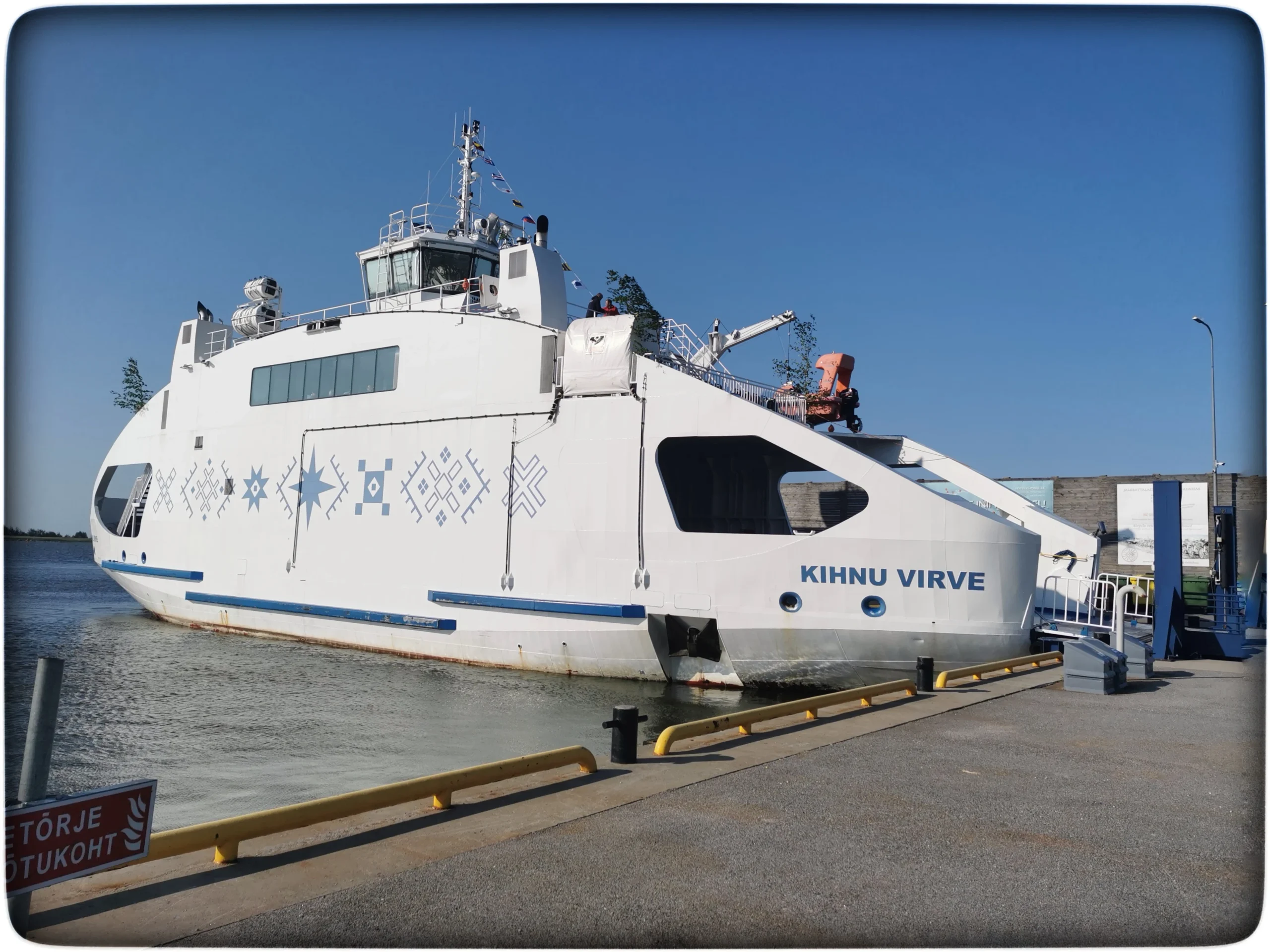 Laev Kihnu Virve oli kummalise väljanägemisega, alla läksid sõidukid ja inimesed teisele korrusele, mööda järsku ja kitsast metalltreppi. Siin oli tuul veel tugevam ja vaatasin kuidas kohe salongi sain. Sees veidike hämar ja jättis kitsa mulje. Kohe ukse ees mõned lauad ja väike söögikoht, mõlemal pool akende all siis istekohad. Läksime tahapoole, seal oli veel vabu kohti. Ei tahtnud minna võõraste juurde, sest omalgi rahvast kaasas ja hea pundis olla. Roosakad nahkistmed olid veidi kummalised, kolm kõrvuti reas ja samasugused nagu bussis. Kõrgetest akendest avanes merele hea vaade.