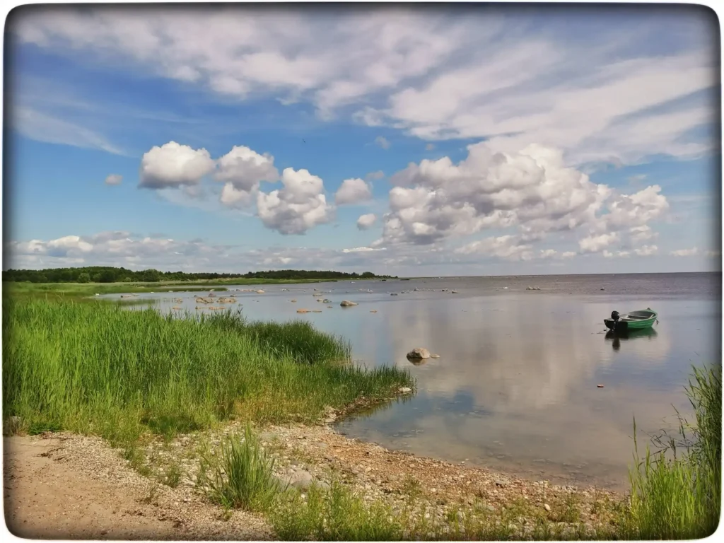 Sõitsime Linaküla kämpingu juurde, seal tundus olevat kaardi järgi pääs mere äärde. Randa oli siin pikalt. Liiv küll pealt õrna taimestiku kihiga kaetud, aga rattaga sõita polnud siin võimalik, tuli käekõrval lükata. Siin küllaltki lage ala, liiv, üksikud kadakad ja jahedam tuul merelt. Rahvast oli siin suplemas küllaga, kuigi üsna jahe täna. Rannas paat oli huvitav ja üldse kogu vaade täitsa olemas, sellega võis jääda rahule. See paat arvatavasti siin sellepärast, et siin Suarõ ninäs (Saare ninas) oli vanasti lautrikoht ja räimepaatide randumiskoht. Siin hooldati ka merepüüniseid ja sorteeriti kalu.