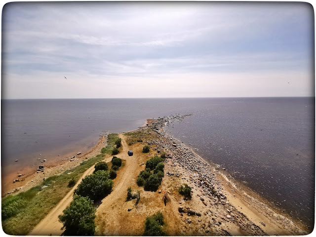Tahtsime mere ääres täna olla, eile see ei õnnestunud. Arvasime, et majaka juurest saame randa. Pöörasime siis ühte teed sisse ja rattad parkisime kadakate vahele villu. Vaade muidu oli ilus, aga liiva polnud, ainult kivid igas mõõdus. Mind huvitas, mida edasi minnes näha on. Vaade kaugele merre ulatuvale kivirivile oli väga kena ja inspireeriv. Eile tuletornist nägin, et keegi kõndis seal. Täna tahtsin mina ka sinna jõuda. Hakkasin siis minema. Rand muidu kivine, aga kadakate vahel liivane. Mingid tundmatud taimed kasvasid kohati puhmastena. Nad olid välimuselt nagu mingid kõrbetaimed, sinakashallid ja okastega lehtede tipus, mis kergelt läbi püksisäärte tunda olid kui neist läbi läksin. Rannas tõusis hallhaigru parv üles, jättes maha kaks ilusat sulge. Ei õnnestunud saada sinna kivirivile, enne tuli suur kraav ette ja tulime tagasi tuldud teed mööda.