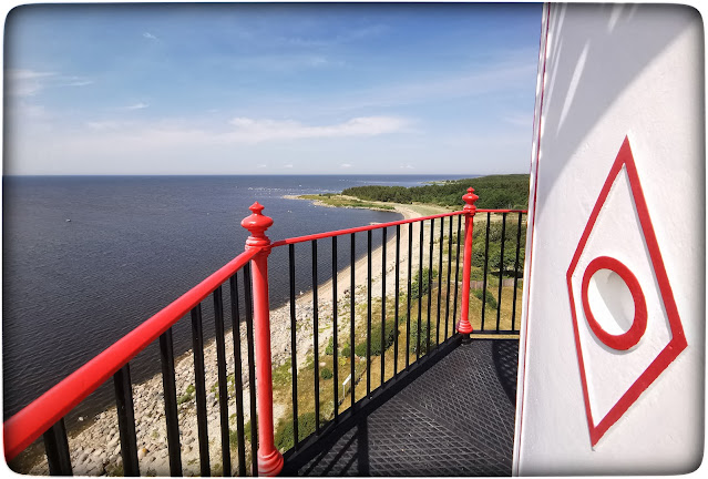 Kasutasin võimalust, külastajaid üleval põhimõtteliselt ei olnud parasjagu ja läksin välja vaateid nautima. Siin oli hästi tuuline ja pääsukesed lendlesid õhuvoolus. Vaated olid lahele ja saarele lummavad, neid võis imetlema jäädagi, aga kahjuks polnud seda aega pikalt. Tuul oli ka karm, küllalt jahe ja sasiv. Kuulsin alt uusi hääli ja tegin kiirelt tiiru ümber torni ära. See oli ilusaid vaateid pakkuv ja ka natuke hirmus, väike kõrgusekartus lõi välja. See torn oli mul esimene mida üldse külastanud olen. Plaan veel mõni rahvale külastamiseks avatud tuletorni üle vaadata.