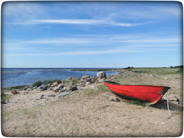 Sõitsime Linaküla kämpingu juurde, seal tundus olevat kaardi järgi pääs mere äärde. Randa oli siin pikalt. Liiv küll pealt õrna taimestiku kihiga kaetud, aga rattaga sõita polnud siin võimalik, tuli käekõrval lükata. Siin küllaltki lage ala, liiv, üksikud kadakad ja jahedam tuul merelt. Rahvast oli siin suplemas küllaga, kuigi üsna jahe täna. Rannas paat oli huvitav ja üldse kogu vaade täitsa olemas, sellega võis jääda rahule. See paat arvatavasti siin sellepärast, et siin Suarõ ninäs (Saare ninas) oli vanasti lautrikoht ja räimepaatide randumiskoht. Siin hooldati ka merepüüniseid ja sorteeriti kalu.