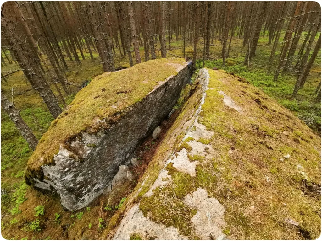 Siin muutus loodus huvitavaks. Üks rahn oli toetumas otse kõrvalt kasvavale männile ja seega mulje nagu puu hoiaks kivi mäest alla veeremast. Matkajuht juhatas meid siin rajast kõrvale saare suurima kivi juurde. Selleks tuli turnida üsna järsust vallseljakust üles, mis arvatavasti on samuti kunagi mandrijää poolt kujundatud.
