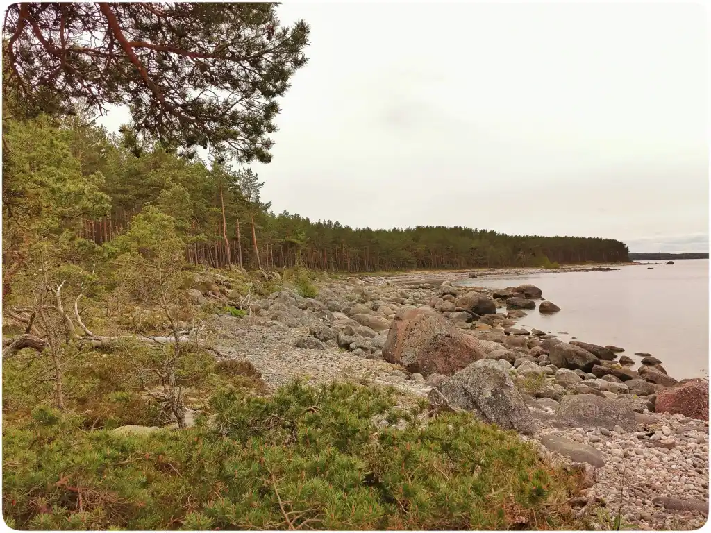 Esimese asjana märkasin, et siine mets on hästi tihe ja muid puid siin ei kasva. Mets on nii ühtlane, suuremaid puid oli mõni üksik. Matkarada kulgeb üsna ranna lähedal, seega on võimalik mõlemal silma peal hoida. Mida rohkem edasi läksime, siis seda enam leidsime siit midagi uut. Rannajoon oli kõige enam erineva ilmega ja järjest kivisemaks läks.