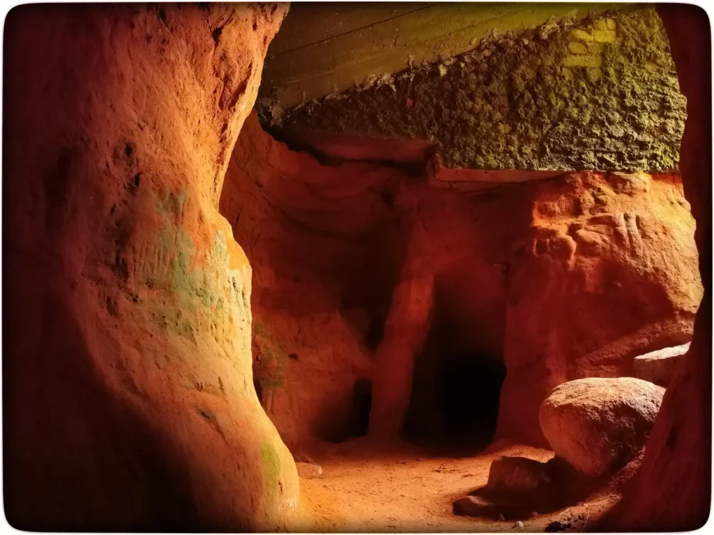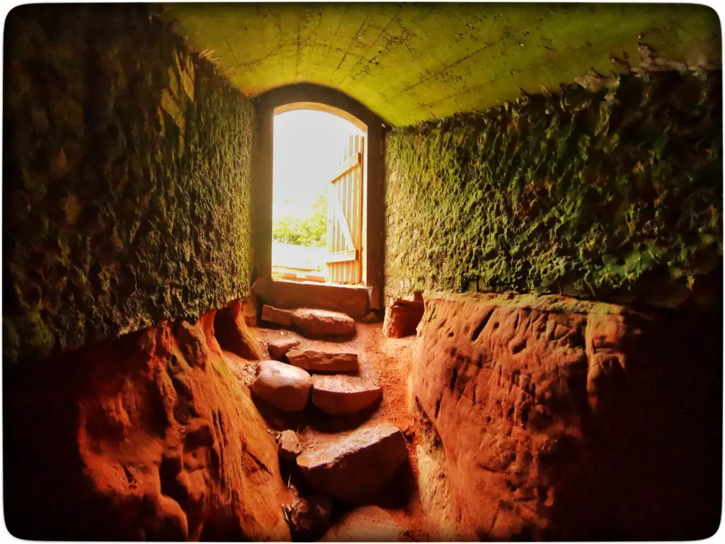 Avasin ukse haagist ja tõmbasin lahti. Otse ees maakividest trepp, mis viis mõned astmed allapoole. Palju valgust ukseavast ei tulnud ja lisavalgus on siin hädavajalik. Natuke üllatuseks väiksem käik viis edasi palju suuremasse koopasaali. Maapind oli väikse kaldenurga all ja pilkane pimedus siin. Mul oli küll võimas taskulamp kaasas, aga see ei suutnud ka korralikult ruumi valgustada. Lisaks muidugi harjumatu valguse muutus silmadel ja seega algul ei näinud hästi niigi, natuke lasin kohaneda. Millegi pärast oli just siin suure koopa lävel algul päris hirmus. Muidu pole varem midagi sellist tundnud, siin oli küll kuidagi tugevalt kõhe. Imelik teadmatuse tunne oli ka lisaks.