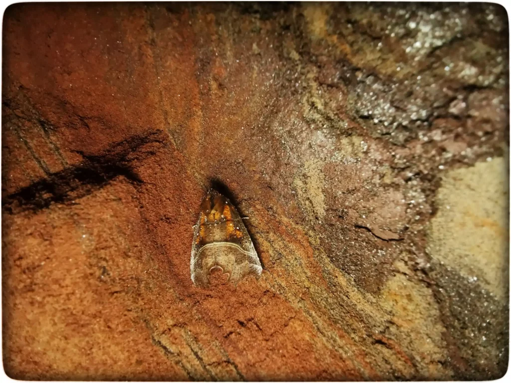 Enne proovisin teha nii pilte, et ühe käega hoidsin lampi ja teisega kaamerat. See oli väga raske, kuna vahel pidi seda tegema endast kõrgemal ja käsi väsis sedasi ruttu ära, värinast rääkimata. Ma polnud tulemustega rahul ja mõtlesin, kui ma juba siin olen, siis tööga pean ka rahule jääma, muidu ei tasuks siia tulek üldse ära. Nii ma siis läksin lõkkeplatsile ja grillvarda abil konksu lahti sain. Riputasin lambi krae külge ja nüüd olid käed vabad. Alustasin nagu uuesti ja vaatasin nüüd hoolikamalt koopa seinu. Kohe enne suurt koobast leidsin seinalt ühe talvituma tulnud liblika. Ta oli omamoodi nutika koha leidnud, tavaliselt külastajad sealt teda ei märkakski, lisaks ta tiivamustrid sulandumas väga hästi ümbrusega kokku. Tema pildistamiseks pidin käed ajama üle pea ja lambi võtma teise kätte, sest altpoolt oleks vari tulnud, kõrvalt oli parem.