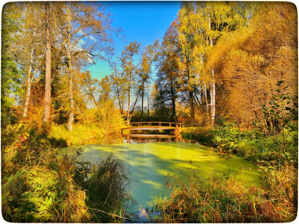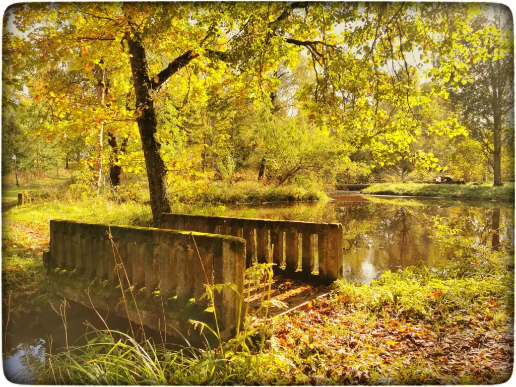 Kõigepealt alustasin tutvumist pargist, kuhu sai maanteelt tulla. Kohalikud on teinud läbi pargi mitmeid otseteid, muidu looduslik kõik. Algul ei arvanud ma midagi sellest kohast, aga kui märkasin esimest silda, siis muutus kõik. Betoonist tehtud ülekäik sobis siia parki väga hästi. Siit vaadatuna oli korraga mitu huvitavat objekti korraga nähtaval. Eriti põnev oli väike paviljon ja kohe hakkasin mõtlema sinna saamise peale. Algul arvasin, et sillast paremale viiv tee läheb ka sinna. Lootusrikkana seadsin sammud sinna suunas, aga ei, see oli taas lihtsalt kohalike teerada. Koht oli ilus muidu. Mulle meeldis see rajake suurte puude vahel.