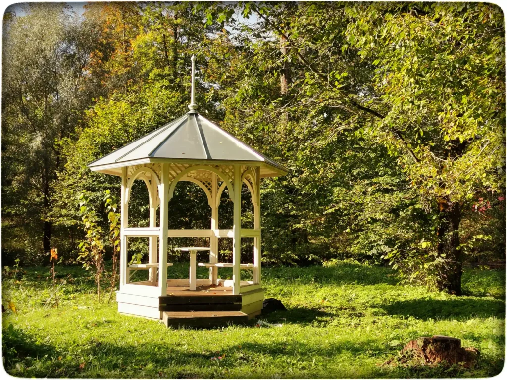 Aeg oli juba sealmaal, et mul läks kõht jube tühjaks ja otsisin kohta kuhu istuda saaks. Muud paremat polnud ja ma läksin sinna paviljoni tagasi. Peamaja oli siit näha ja juba oli natuke paistmas peegeldust vitraažist ühele sambale. Leidsin, et ootan veel natuke, siis liigub see paremasse kohta. Paviljon õnneks oli veel vaba, kuigi koolinoored tulid selle aja peale koju. Paviljonis einestades märkasin muid pisiasju lähemalt. Läbustajad pole suutnud isegi paviljonist käsi eemale hoida. On tehtud tuunimist negatiivses võtmes. Piirdeaia on nad ära lõhkunud ja siin on olnud isegi väravad, millest nüüd alles vaid hinged tugipostide küljes.