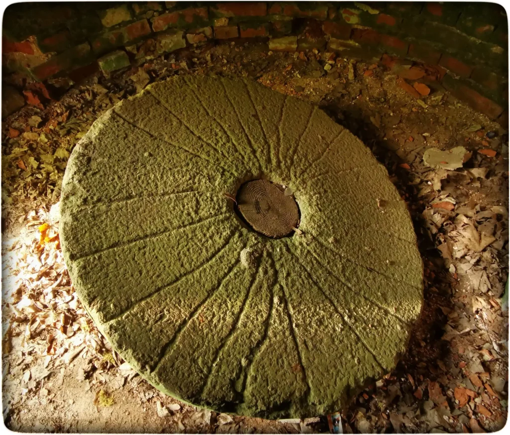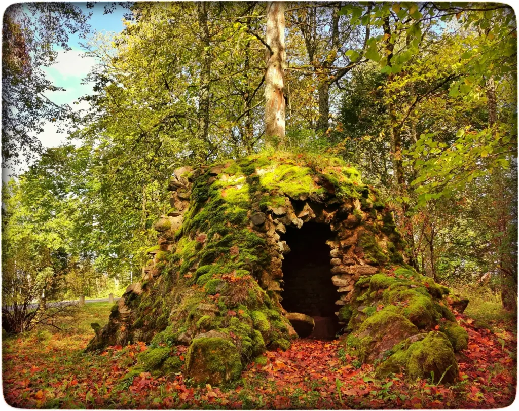 Käisin tiiru ära ümber pargi ja vaatasin ka kõrval olevasse metsatuka, aga ei leidnud kunstkoobast ikka üles. Siin oli õnneks ka kaart pargi kohta ja sealt sain vihje kätte. Ma olin seni täitsa valest suunast otsinud. Tegelik koht oli nii lähedal tegelikult, poe kõrval pargis. Algul oli teda raske märgata, sest grott üleni samblasse mattunud ja ühtegi rada ka juurde ei viinud, reetis pikapeale mustav sissepääsu ava. Tundus see koht nii mahajäetud olevat. Sees olev lauake ka külili vajunud, milleks vana veskikivi pandud prussi otsa. Kunstlikult tehtud koobas nii suur, et siin saaks vabalt püsti seista ka pikka kasvu inimene. See näis olevat ehitatud kõigepealt telliskivi voodriga ja siis pealmine kiht laotud maakividest. Huvitav looming on tehtud omalajal, kuigi paneb mõtlema, milleks seda tehti ja mis funktsioon tal mõisa aegu oli.