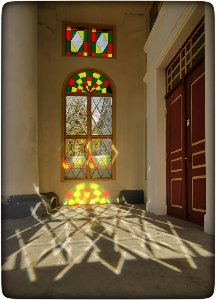 Peale kerget kehakinnitust läksin uuesti peamaja vitraaže vaatama, nüüd peaks päike olema juba parema nurga all. Koht oli juba enam-vähem, aga siiski polnud päris soovitud, põrandal oleks see ilusam olnud, aga mul polnud nii palju aega selle ära ootamiseks. Ega sellel variandil ka viga polnud, kui võtta arvesse värvitute klaaside peegeldusest tekkinud muster. Seda ei osanud küll oodata ja oli isegi heaks täienduseks.